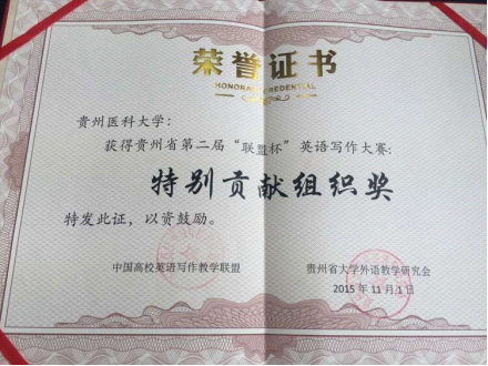 本次大赛,全省共有22所高校的22,380多名学生参加了网络初赛。其中69名选手脱颖而出,于2015年11月1日参加了“贵州省第二届“联盟杯”高校英语写作大赛”的总决赛。我校共有七名同学参加了总决赛的激烈角逐。最终,基础医学院的罗力同学荣获了一等奖;口腔医学院李姣同学、药学院陈露露同学荣获二等奖;KK对战平台