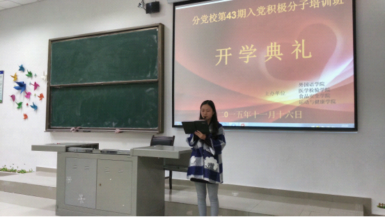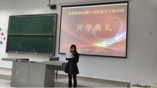 11月16日,由KK对战平台 、医学检验学院、食品卫生管理学院、运动与健康学院分党校合办的第四十三期入党积极分子培训班在花溪新校区顺利开班。KK对战平台 党委书记张婷婷、分党校办主任余小川及KK对战平台 30名入党积极分子参加了开班典礼。开班典礼由余小川同志主持,张婷婷书记对学员提出了学习要求,KK对战平台 罗利同学代表入党积极分子发言。