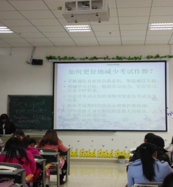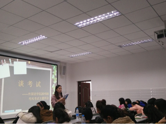 各个年级于2015年11月至12月陆续召开了以“诚信考试,杜绝作弊”为主题的班会,班会由各年级辅导员主持。