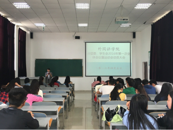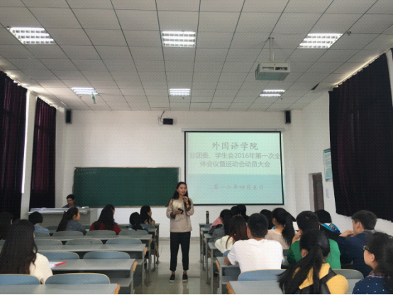 分团委、学生会2016年第一次全体会议暨运动会动员大会。会议由学生会主席丁万主持,分团委负责人徐艺娟老师出席会议并作讲话。