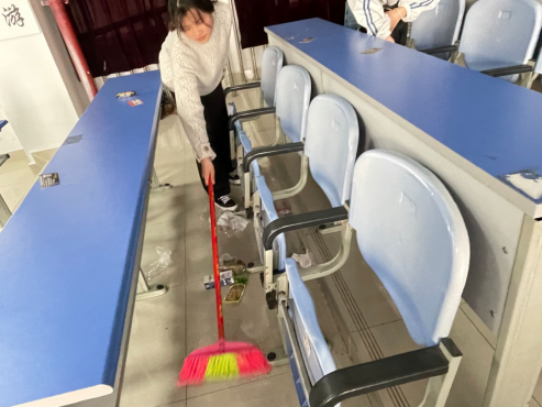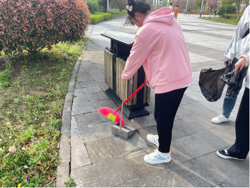 学生干部带头,以身先行为学院做志愿服务。同学们从自己的身边做起,携带清洁工具如夹子和垃圾篓进行校园清洁工作,并将清洁的照片分享至班级群。