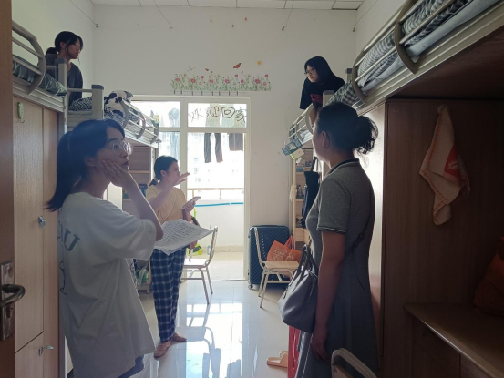 党委副书记马琳娜、新生辅导员黎文清老师及学生会成员走访了各新生寝室,了解新生的入学状态与未来需求,送去学院的关心与关爱。