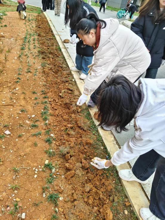 活动现场,大家分工明确,一部分同学负责捡拾绿化区域中的石头、石子及垃圾废品,他们仔细清理着每一处角落,为后续的种植工作做好准备;另一部分同学则拿起工具,开始松土、撒花种、施肥。师生齐心协力,共同为校园增添一抹新绿