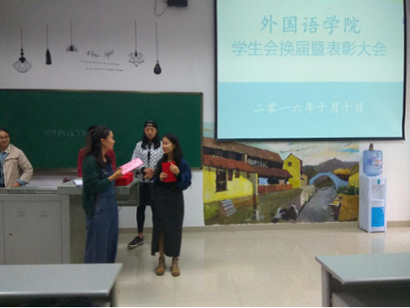 首先,徐老师代表学生会老成员为新成员致欢迎辞,欢迎他们的加入,然后总结上学期的相关工作。其次,徐老师为老成员们以及上一学年表现优异的同学颁发证书,并发表了讲话。她表示:感谢老成员们的辛勤付出,因为有了大家的共同努力我们才能有今天的成绩,今后大家还需齐心协力,团结互助。最后,一些优秀的老成员上台分享了他们的工作经验。