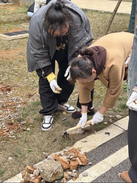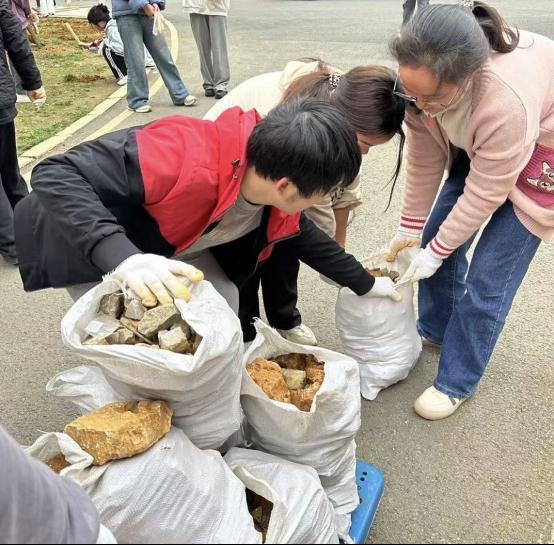 活动现场,大家分工明确,一部分同学负责捡拾绿化区域中的石头、石子及垃圾废品,他们仔细清理着每一处角落,为后续的种植工作做好准备;另一部分同学则拿起工具,开始松土、撒花种、施肥。师生齐心协力,共同为校园增添一抹新绿